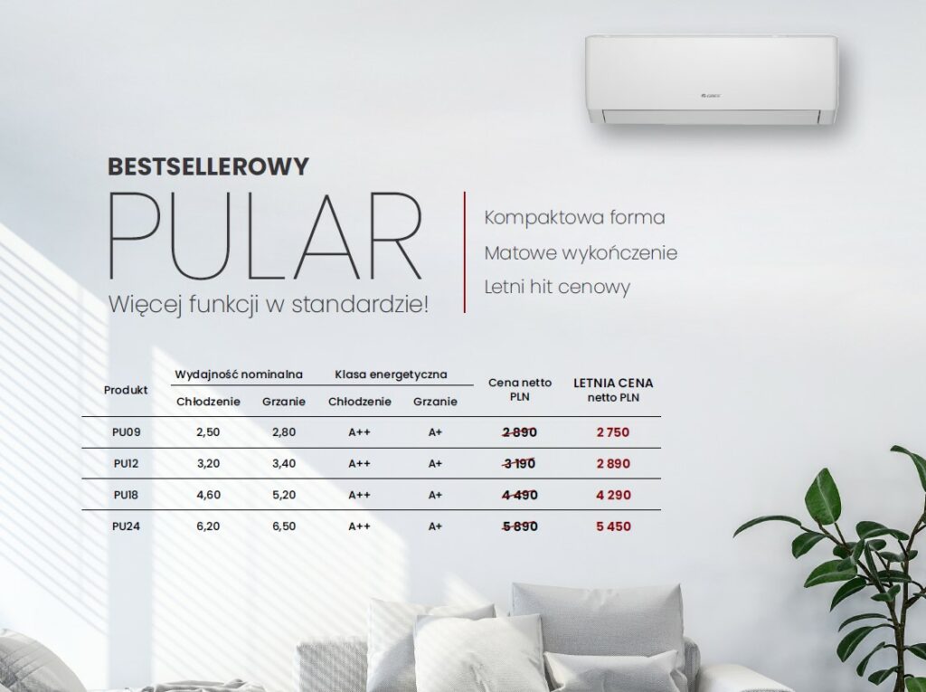 Klimatyzator ścienny GREE model Pular. Pular charakteryzuje się białym, matowym wykończeniem, niewielkimi rozmiarami oraz klasycznym wyglądem, który wkomponuje się w każde wnętrze. Standardowym wyposażeniem Pulara jest bezprzewodowy pilot oraz moduł Wifi, dzięki któremu można sterować urządzeniem nawet wtedy, gdy jesteśmy poza domem. Funkcje modelu Pular: utrzymanie +8oC : ogrzewanie pomieszczenia, które jest nieużytkowane do 8oC…