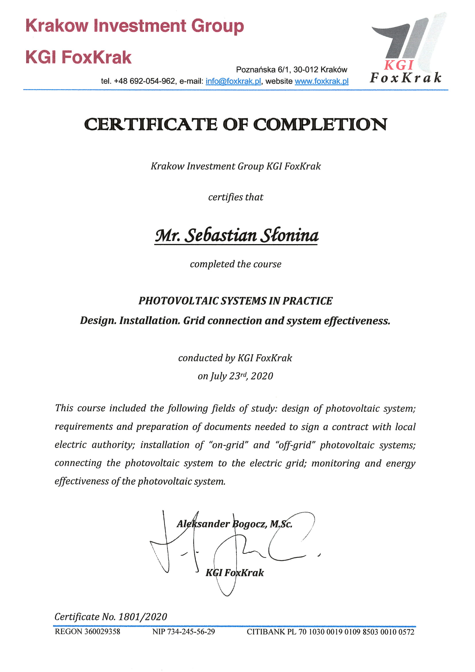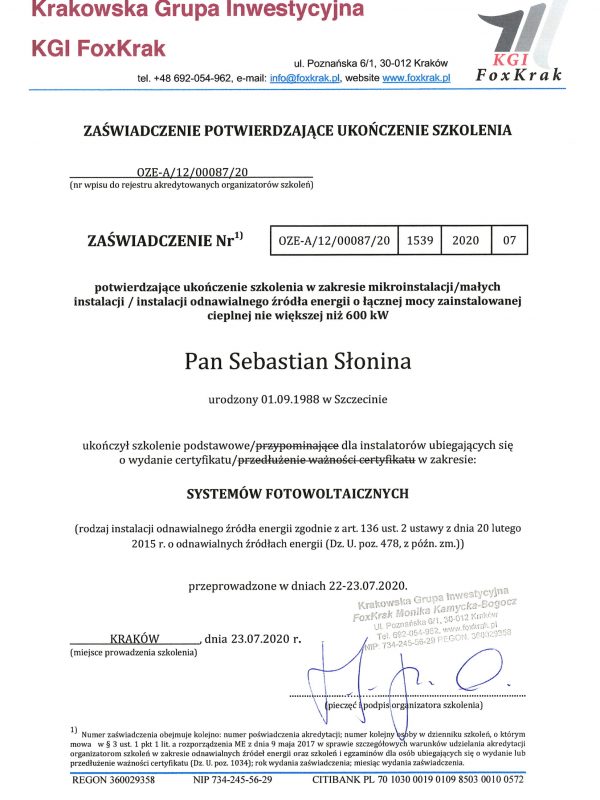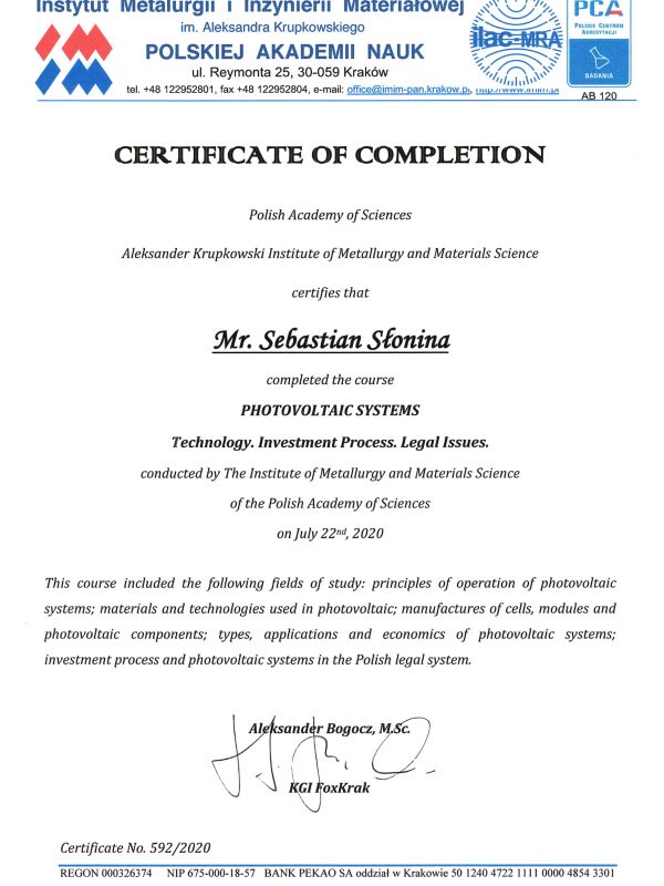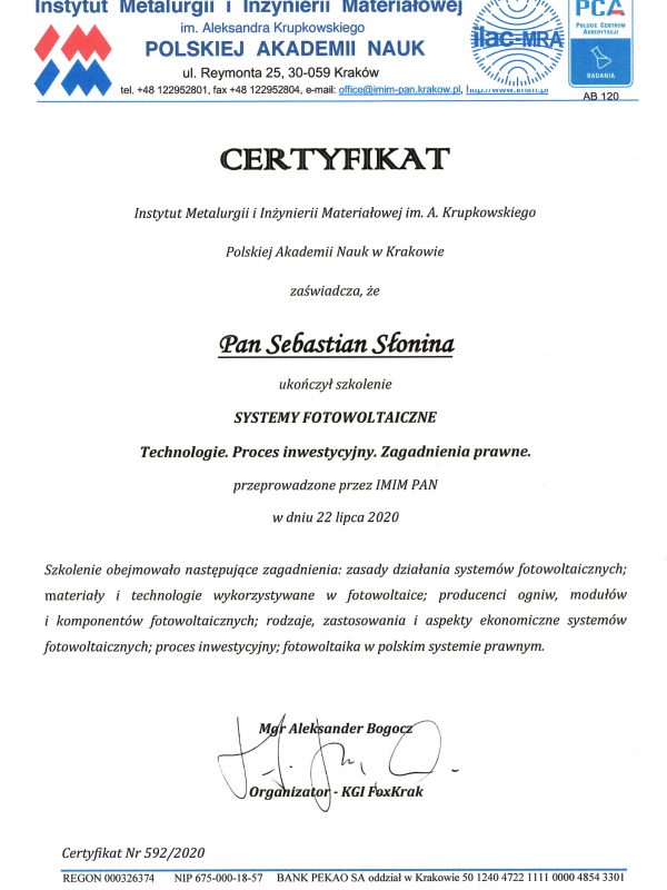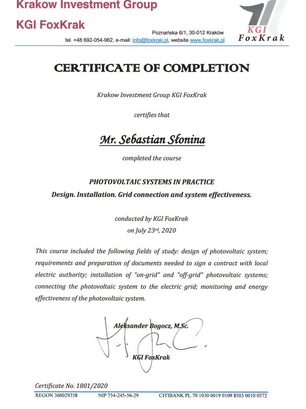 Ukończyliśmy również szkolenia dla Instalatorów systemów fotowoltaicznych.
