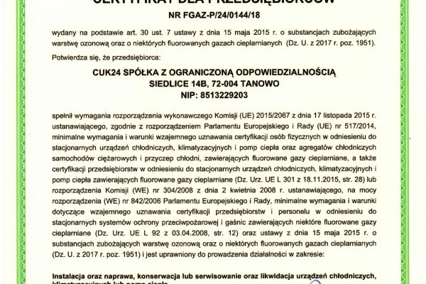 Spółka CUK24, powstała w 2018 roku, wcześniej firma funkcjonowała przez kilka lat jako Centrum Usług Klimatyzacyjnych.