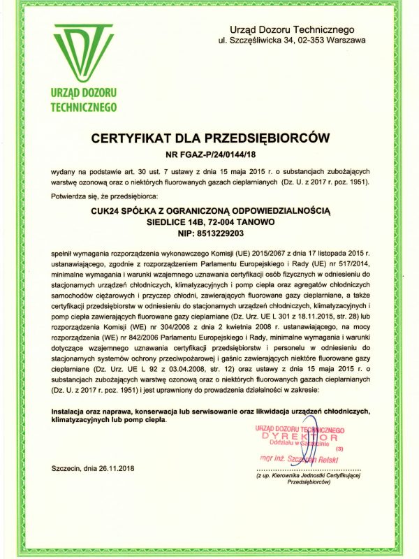 Posiadamy niezbędne certyfikaty i uprawnienia, które są wymagane do wykonywania usług w branży HVAC, m.in. uprawnienia certyfikowane przez Urząd Dozoru Technicznego: FGAZ.
